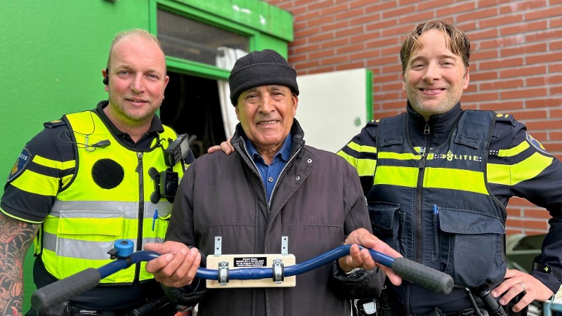 Gistermiddag kreeg meneer Chami uit Overvecht een blauw stuur uitgereikt door de politie. Hiermee sprak de politie haar waardering uit voor het mooie en dankbare werk van meneer Chami: het helpen van jongeren in de wijk. Hij doet dat door het belangeloos repareren van fietsen, maar ook door die verbinder te zijn die de wijk zo goed kan gebruiken.