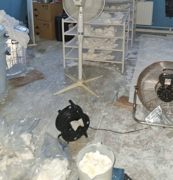 In de woning werd bijna 50 kilo aan procaïne gevonden (een stof waarmee cocaïne versneden wordt), 20 liter zoutzuur, 20 liter aceton en lege jerrycans waar zo’n 660 liter aceton in heeft gezeten. Die 660 liter aceton is hoogstwaarschijnlijk in het riool geloosd, wat uiteraard schadelijk is voor het milieu. Dit soort grote hoeveelheden aceton zijn levensgevaarlijk als daar bijvoorbeeld een vonk (vuur) bij komt. Dat zou een enorme explosie veroorzaken met alle gevolgen van dien.