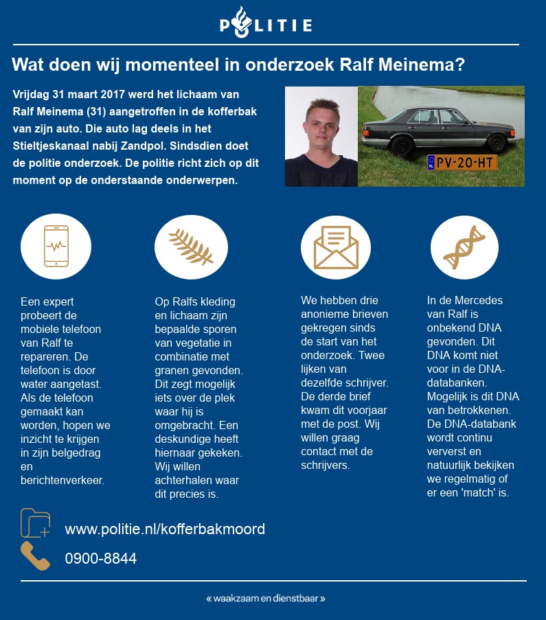 Het onderzoeksteam heeft al wat puzzelstukjes verzameld, maar heeft nog geen compleet beeld van wat er is gebeurd. Zo heeft de politie bijvoorbeeld nog geen duidelijkheid over een motief voor de dood van Ralf Meinema. Sinds 5 februari 2018 kan het publiek via het dossier politie.nl/kofferbakmoord scenario's aanleveren. Heeft u een idee wat er gebeurd zou kunnen zijn met Ralf? Of weet u wie verantwoordelijk zou kunnen zijn voor zijn dood? Laat al uw informatie achter via het tipformulier.