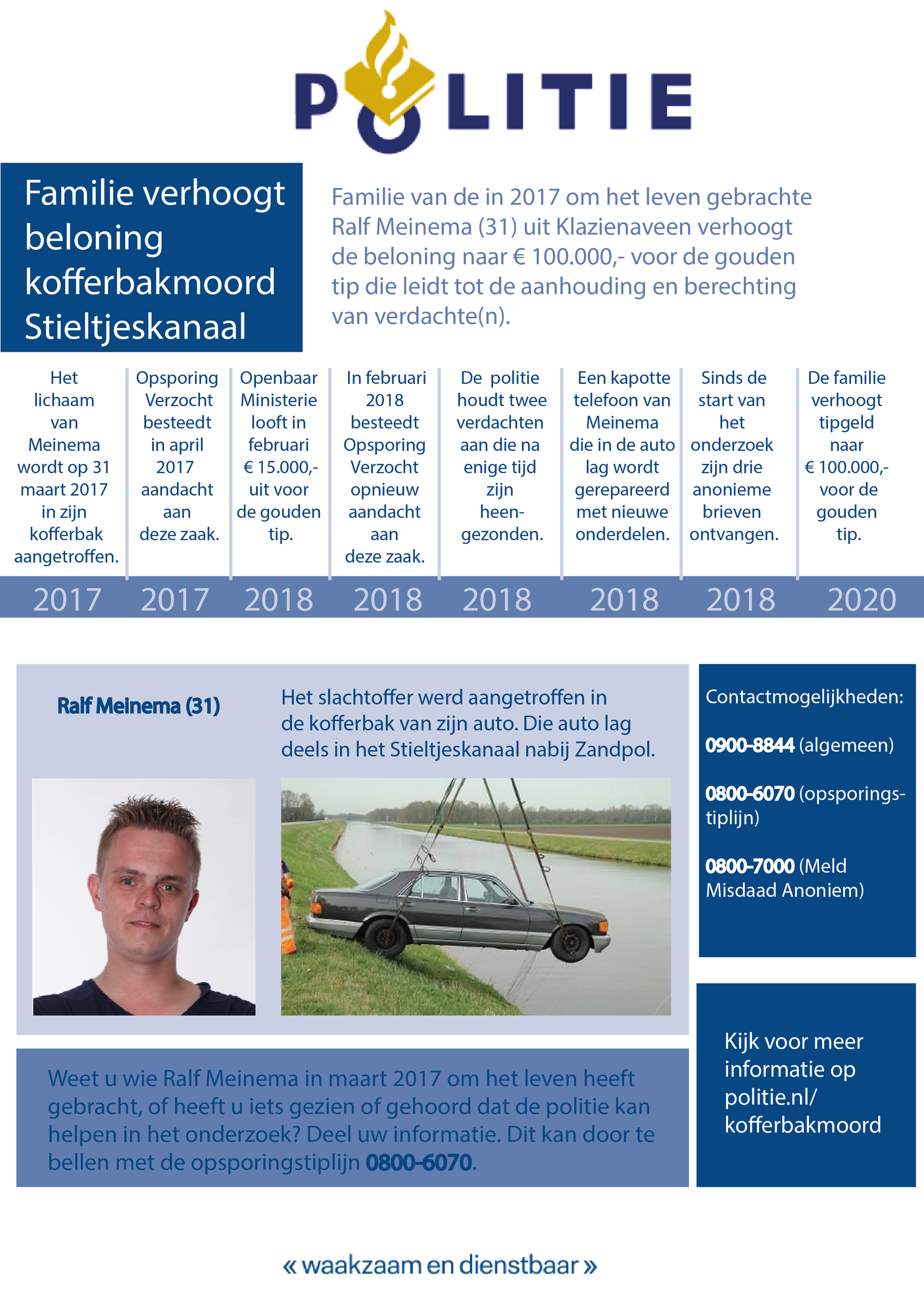 Heeft u een idee wat er gebeurd zou kunnen zijn met Ralf? Of weet u wie verantwoordelijk zou kunnen zijn voor zijn dood? Laat al uw informatie achter via het tipformulier onderaan deze pagina. Of neem telefonisch contract op met de politie in Noord-Nederland via 0900-8844 (hier kunt u zonder uw naam te noemen ook vragen om een vertrouwelijk gesprek) of met Meld Misdaad Anoniem via 0800-7000. Uw tips, vragen en suggesties worden elke dag bekeken door een speciaal team. Waar mogelijk wordt een terugkoppeling op de reacties toegevoegd aan dit dossier. Er is een beloning van 15.000 euro uitgeloofd voor de gouden tip.
