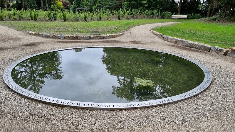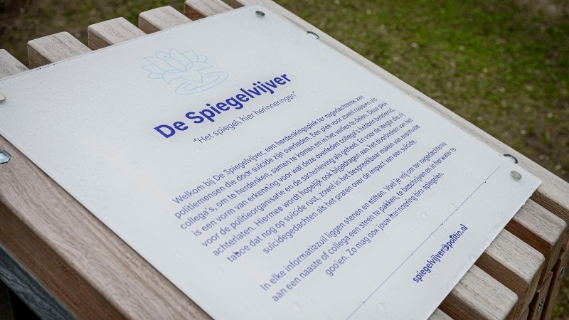 Informatiebord bij De Spiegelvijver; de herdenkingsplek voor nabestaanden en collega's van politiemensen die door suïcide zijn overleden.