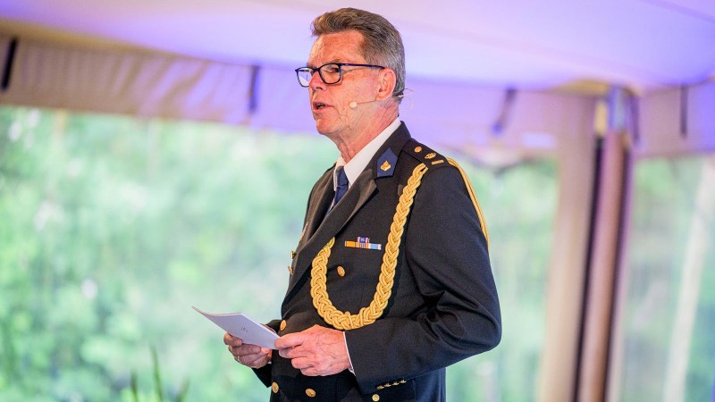 Leonard Kok, directeur van de Politieacademie, houdt een toespraak tijdens de opening van De Spiegelvijver.