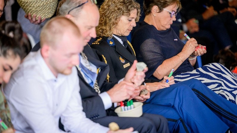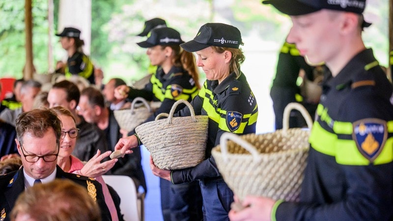 Politieaspiranten delen kiezelstenen uit aan de genodigden bij de opening van De Spiegelvijver.