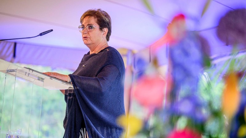 Korpschef Janny Knol spreekt de zaal toe tijdens de opening van De Spiegelvijver, de herdenkingsplek voor nabestaanden en collega's van politiemensen die door suïcide zijn overleden.