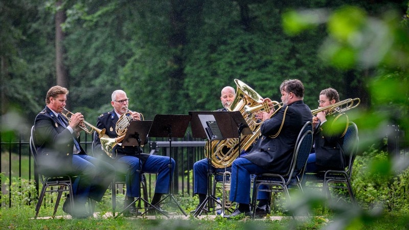 De blazers van het politieorkest begeleiden de opening van De Spiegelvijver.