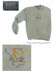 De man droeg een sweater van het merk ‘Besco’. Op de sweater zit een logo met het opschrift: Bewegen door de lucht – Lucht door bewegen. De sweater werd in 1998 door het bedrijf ‘Roche’ ter beschikking gesteld aan deelnemers van de Cystic Fibrosis Sportdagen.